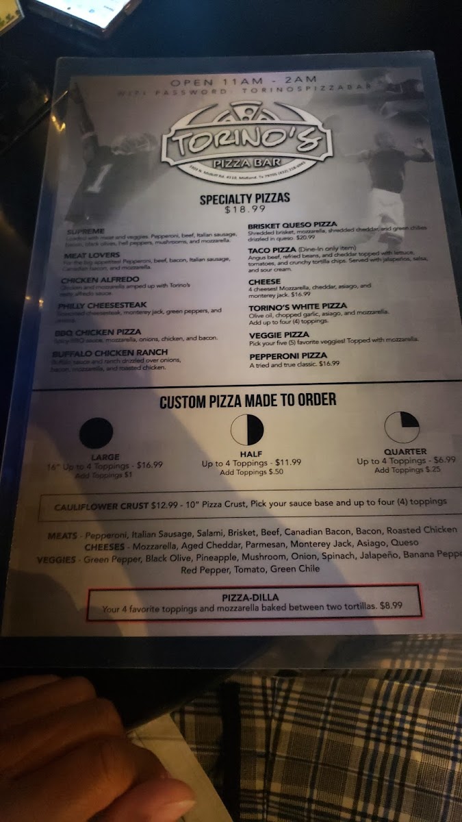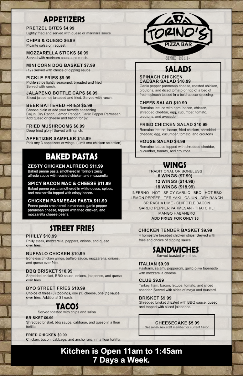 Torino's Pizza Bar in Midland, TX, is a vibrant spot that artfully blends a pizza restaurant with a lively sports bar atmosphere. Their menu is a delightful mix of specialty pizzas, street fries, and hearty bar favorites. The Specialty Pizzas stand out, especially the Supreme loaded with meats and veggies, and the Philly Cheesesteak pizza that layers seasoned steak with a blend of Monterey Jack and mozzarella. For those seeking bold flavors, the Street Fries options such as the Philly, Buffalo Chicken, and BBQ Brisket varieties deliver a rich, cheesy experience over crispy fries. Not to be overlooked, the Chicken Tender Basket offers a comforting classic, while the cheesecake—with customizable drizzles—makes for a sweet finish.